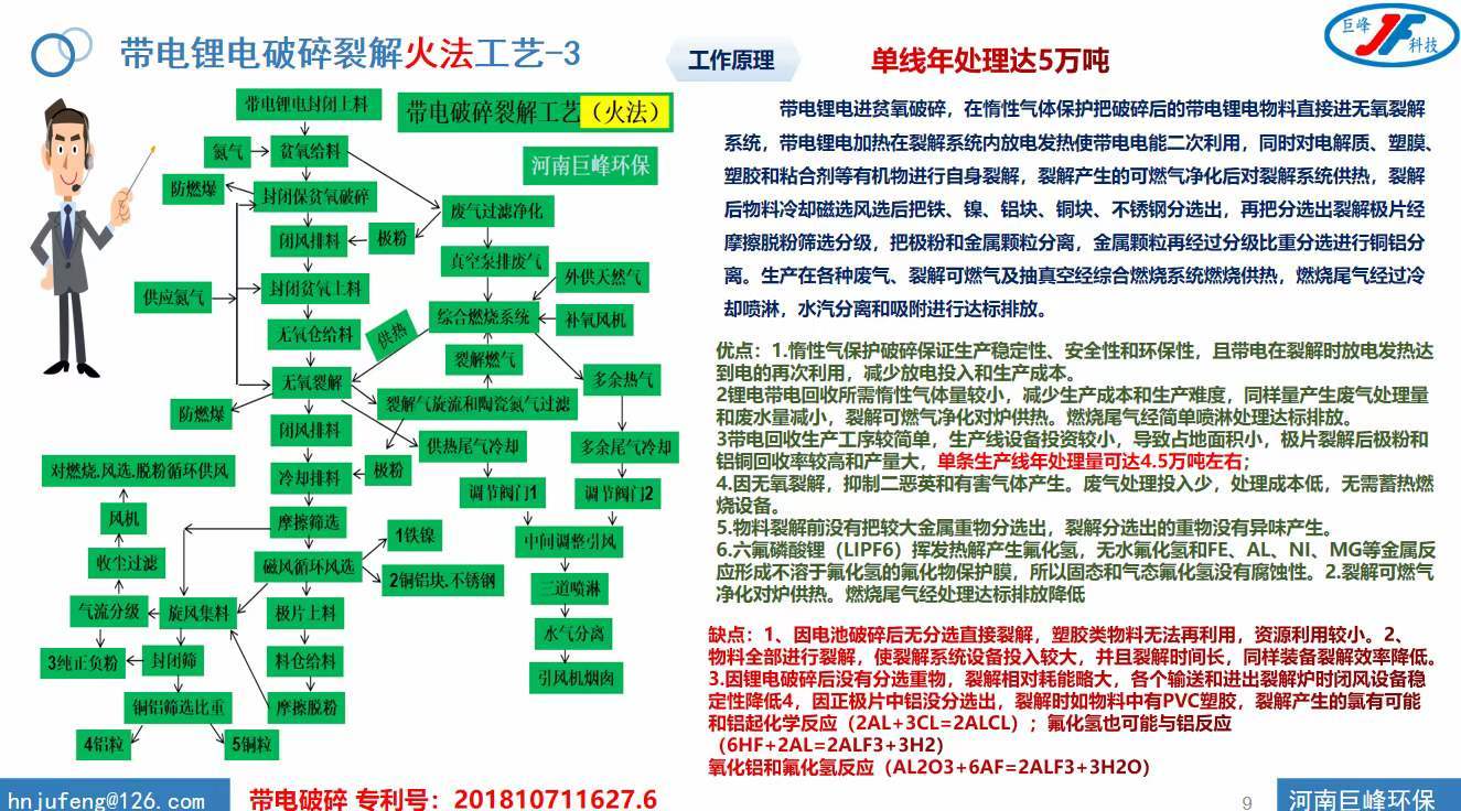 廢舊鋰電池回收設(shè)備和退役鋰電池回收裝置的技術(shù)上都有了更進(jìn)一步的提升,從之前的單獨(dú)物理法破碎廢舊鋰電池到現(xiàn)在火法相結(jié)合,可以每年單線處理掉5萬噸。帶電的鋰電池進(jìn)貧氧破碎系統(tǒng),在惰性氣體保護(hù)下把破碎后的帶電鋰電池物料直接送進(jìn)無氧裂解系統(tǒng),帶電鋰電池加熱在裂解系統(tǒng)內(nèi)放電發(fā)熱使帶電的電能二次利用,同時對電解質(zhì)、塑膜、塑膠和粘合劑等有機(jī)物進(jìn)行自身裂解,裂解產(chǎn)生的可燃?xì)鈨艋髮α呀庀到y(tǒng)供熱,裂解后物料冷卻、磁選、風(fēng)選后把鐵、鎳、鋁塊、銅塊、不銹鋼分選出,再把分選出裂解極片經(jīng)摩擦脫粉篩選分級,把極粉和金屬顆粒分離,金屬顆粒再經(jīng)過分級比重分選進(jìn)行銅鋁分離。生產(chǎn)在各種廢氣裂解可燃?xì)饧俺檎婵战?jīng)綜合燃燒系統(tǒng)燃燒供熱,燃燒尾氣經(jīng)過冷卻噴淋,水汽分離和吸附進(jìn)行達(dá)標(biāo)排放。